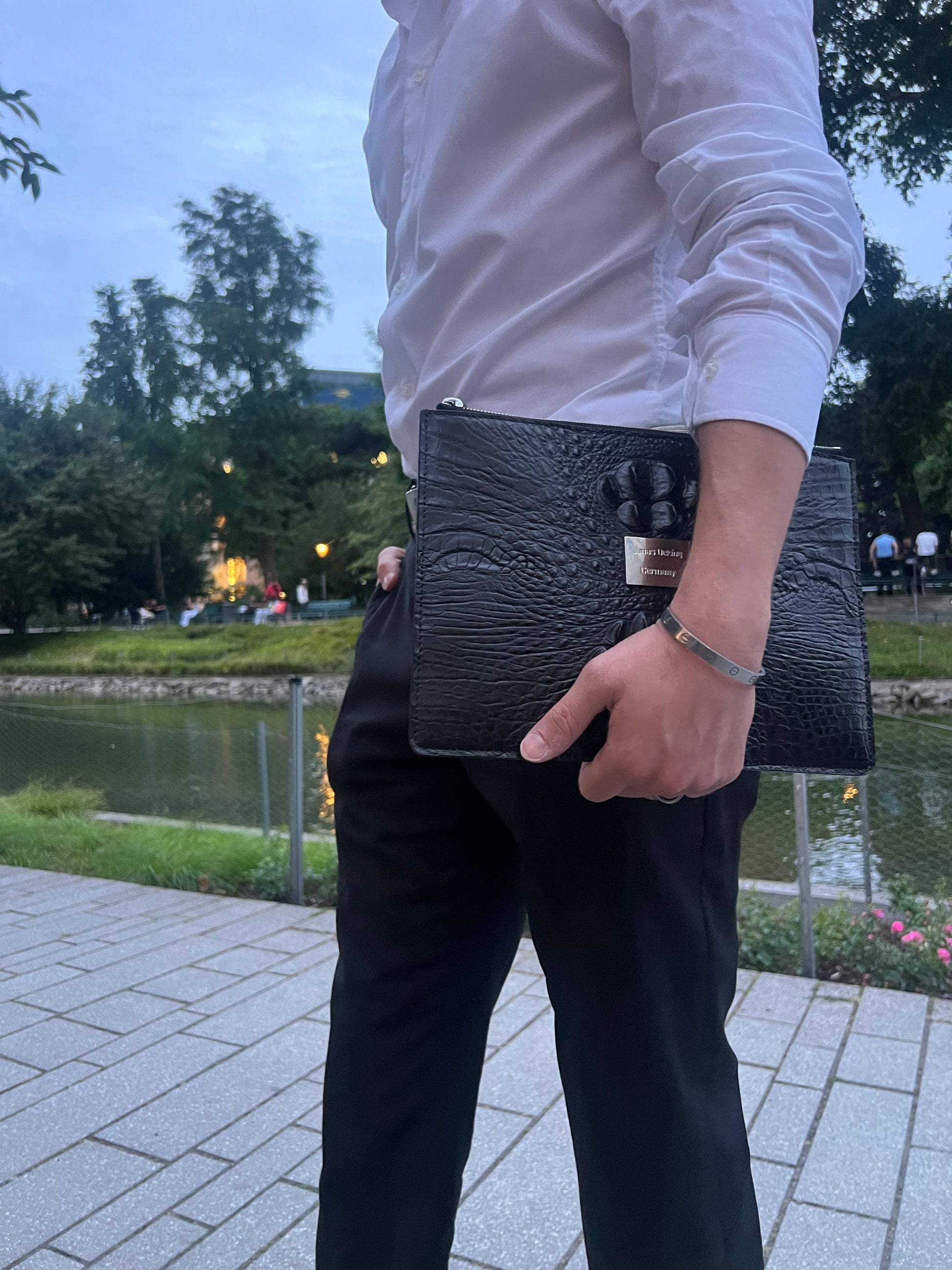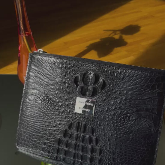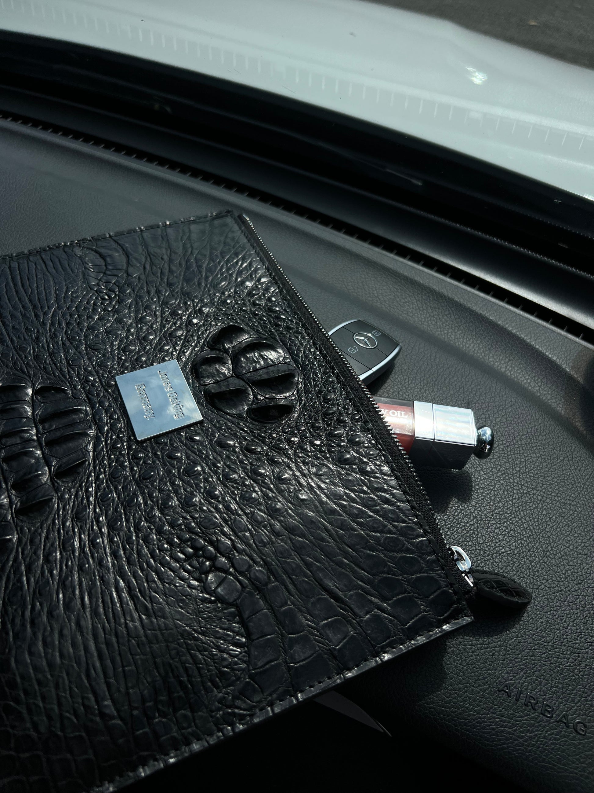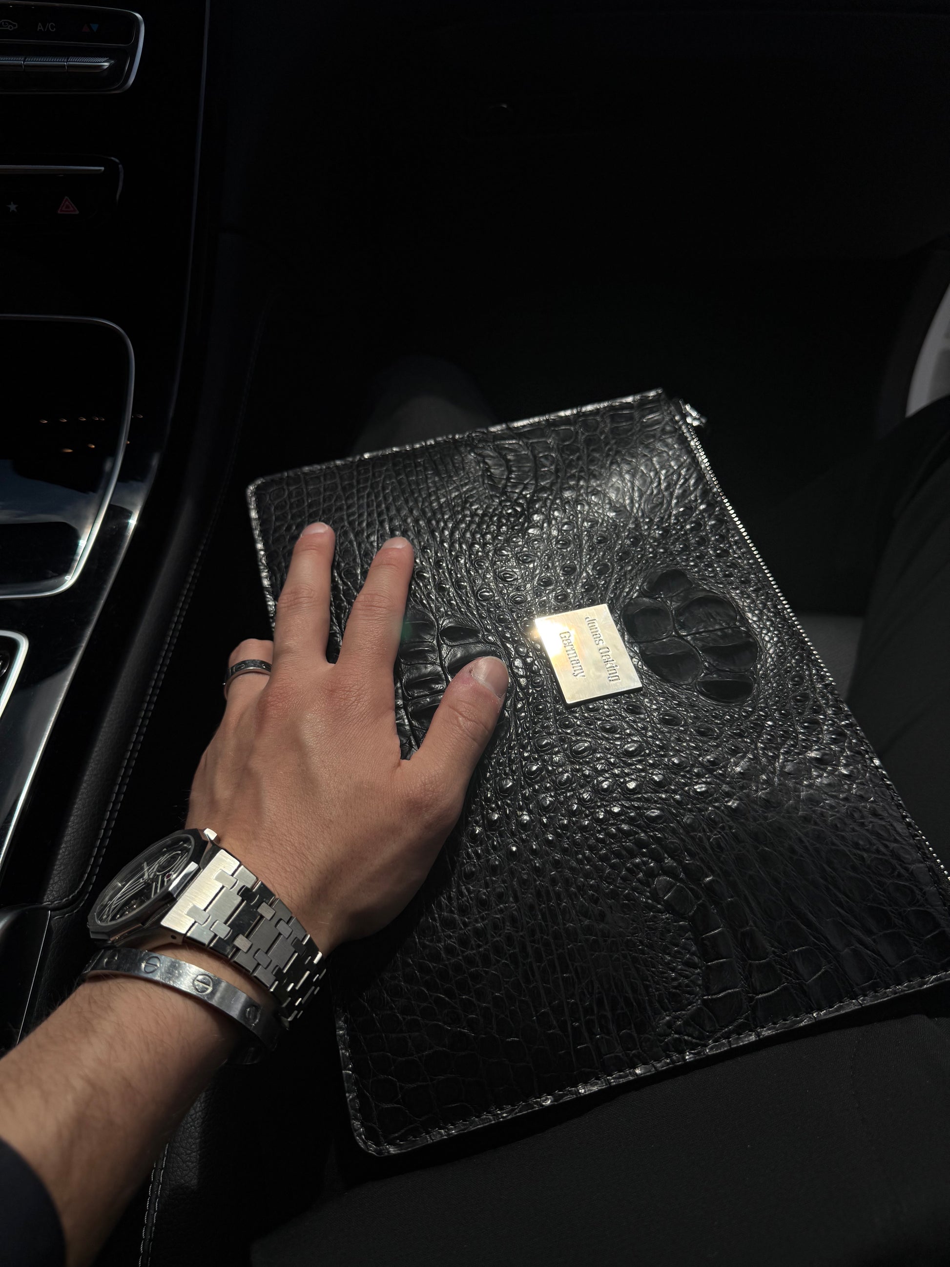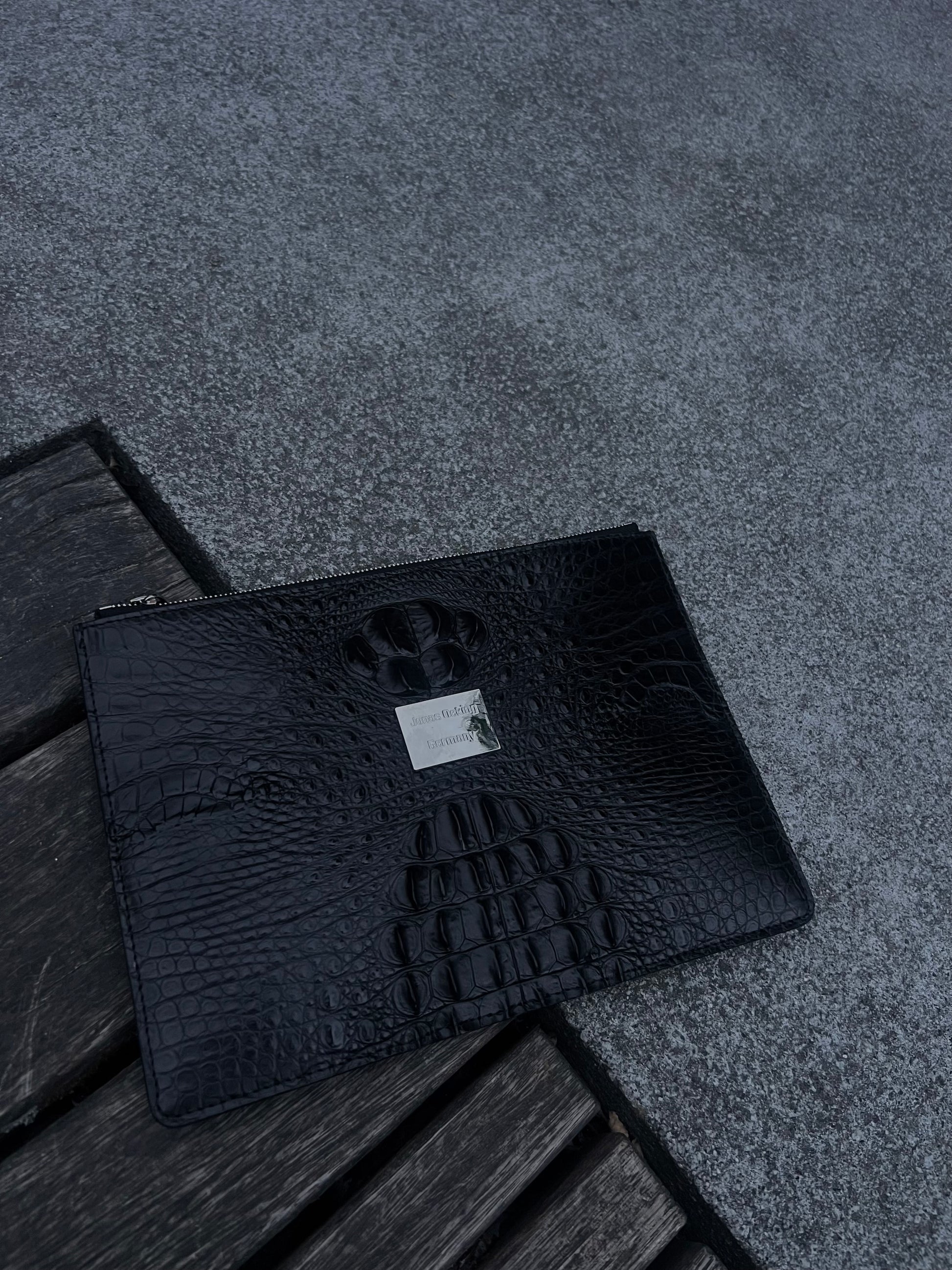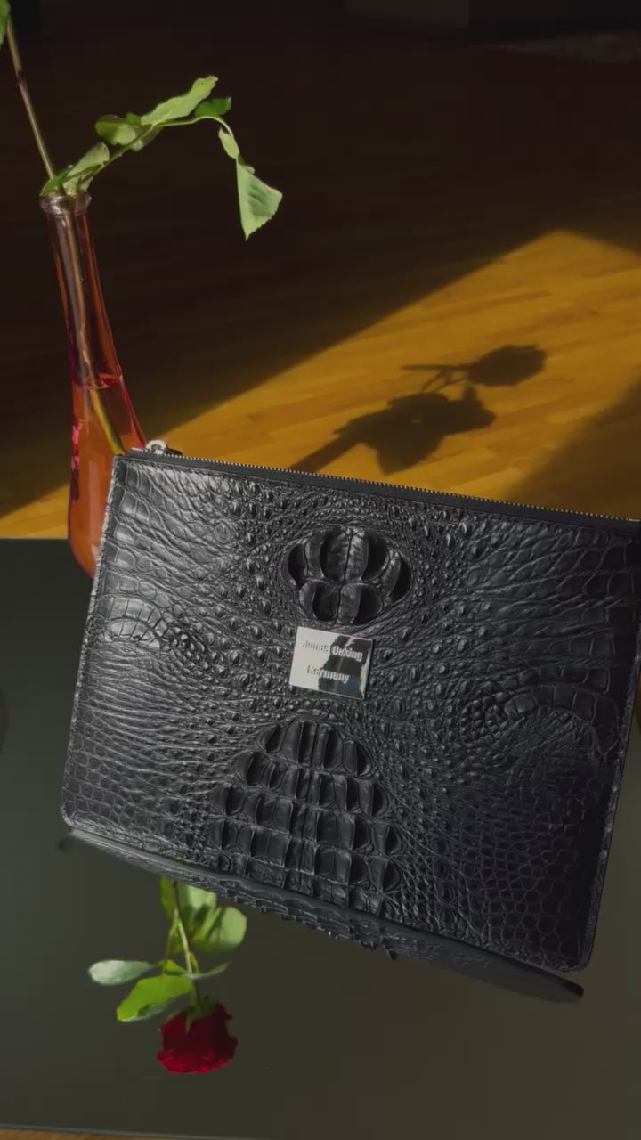 Gefertigt aus edlem, geprägtem Krokodilleder mit markanter Struktur und glänzender Tiefschwärze, liegt sie wie geschaffen in der Hand derer, die sich nicht erklären müssen.